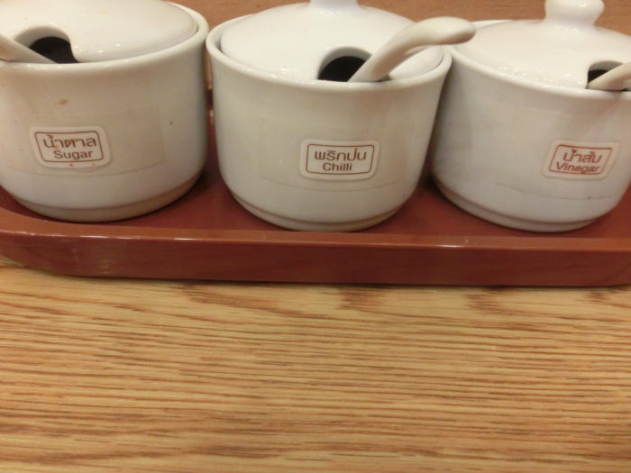 卓上に調味料があるのですが、それはやはりタイ人の味覚に合わせたこの3種類。